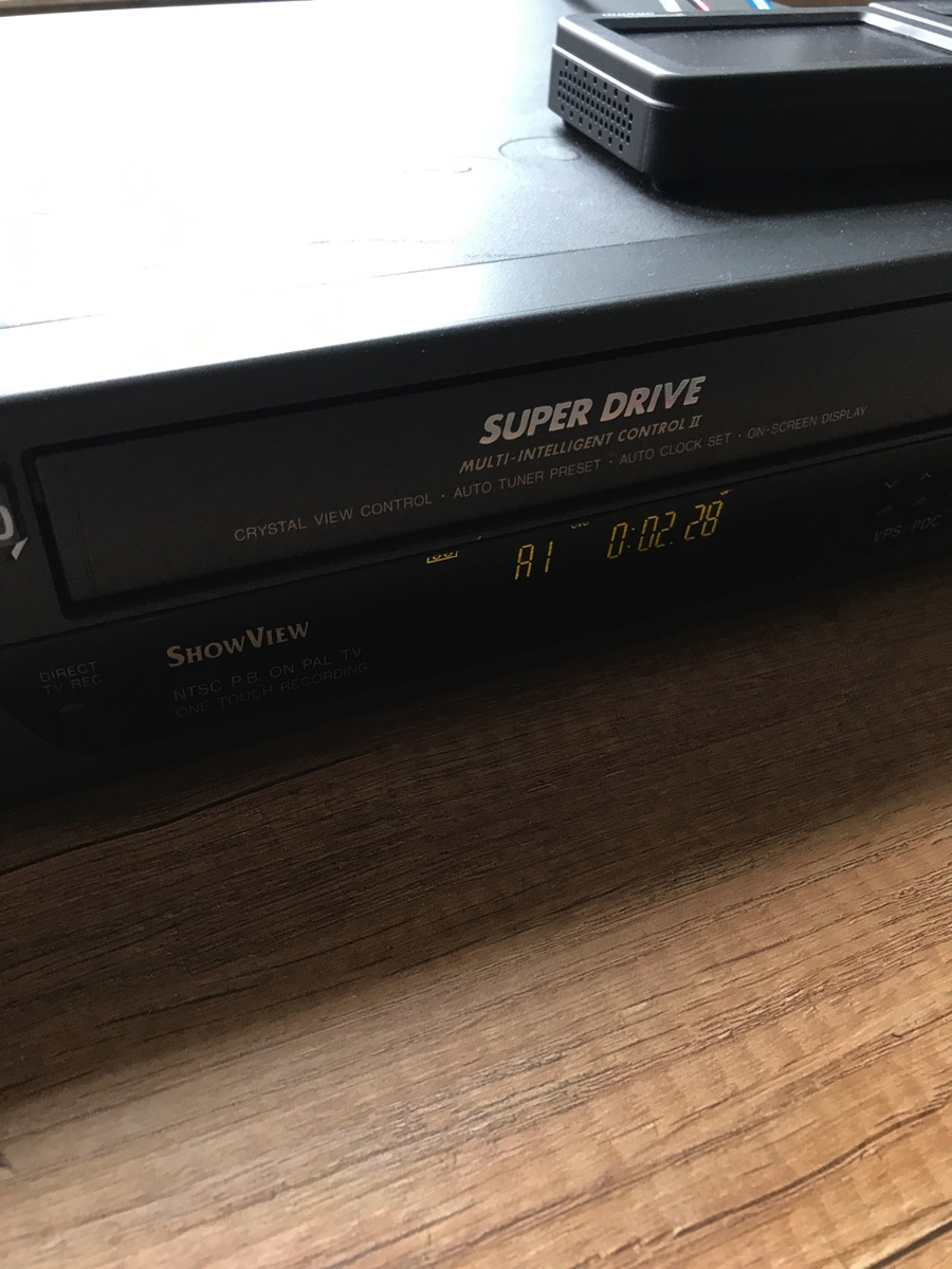 Man braucht dazu natürlich erst mal ein Abspielgerät. Zum Glück hat mein Freund @abspann noch nichts von Marie Kondo gehört und deshalb in seinem Keller noch einen sehr gut erhaltenen VHS-Recorder stehen (Super Drive!).