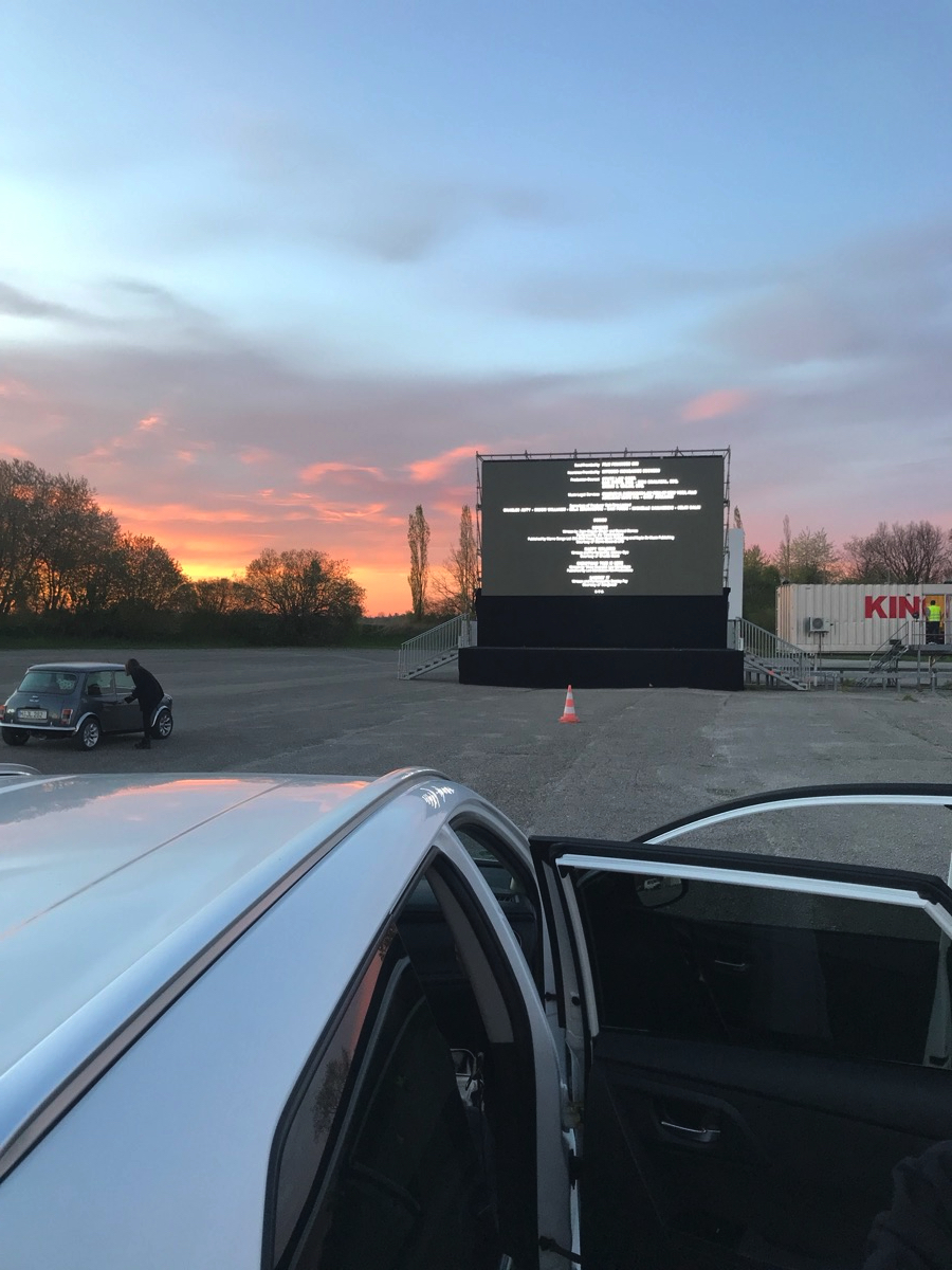 Einerseits beginnt der Film schon um 19:00. Wegen der Ausgangssperre. Damit alle wieder pünktlich um 22:00 zu Hause sind. 19:00 bedeutet aber: es ist noch hell. Und bei Helligkeit braucht man eine andere Leinwand, als bei Dunkelheit. Eine aktiv beleuchtete. Und die ist drastisch kleiner, als die zwei Standardleinwände aus dem Normalbetrieb. Und dann ist so ein Autokino bei Tageslicht betrachtet eigentlich eine ziemlich triste Angelegenheit. Ein riesiger, zubetonierter Parkplatz, draußen vor der Stadt. Am Rand steht eine traurige Baracke, in der Pommes mehr schlecht als recht frittiert werden. Und die beiden Familienmitglieder auf dem Rücksitz haben es nicht ganz so einfach die ganze Leinwand zu sehen. Da sind einige Verrenkungen nötig.