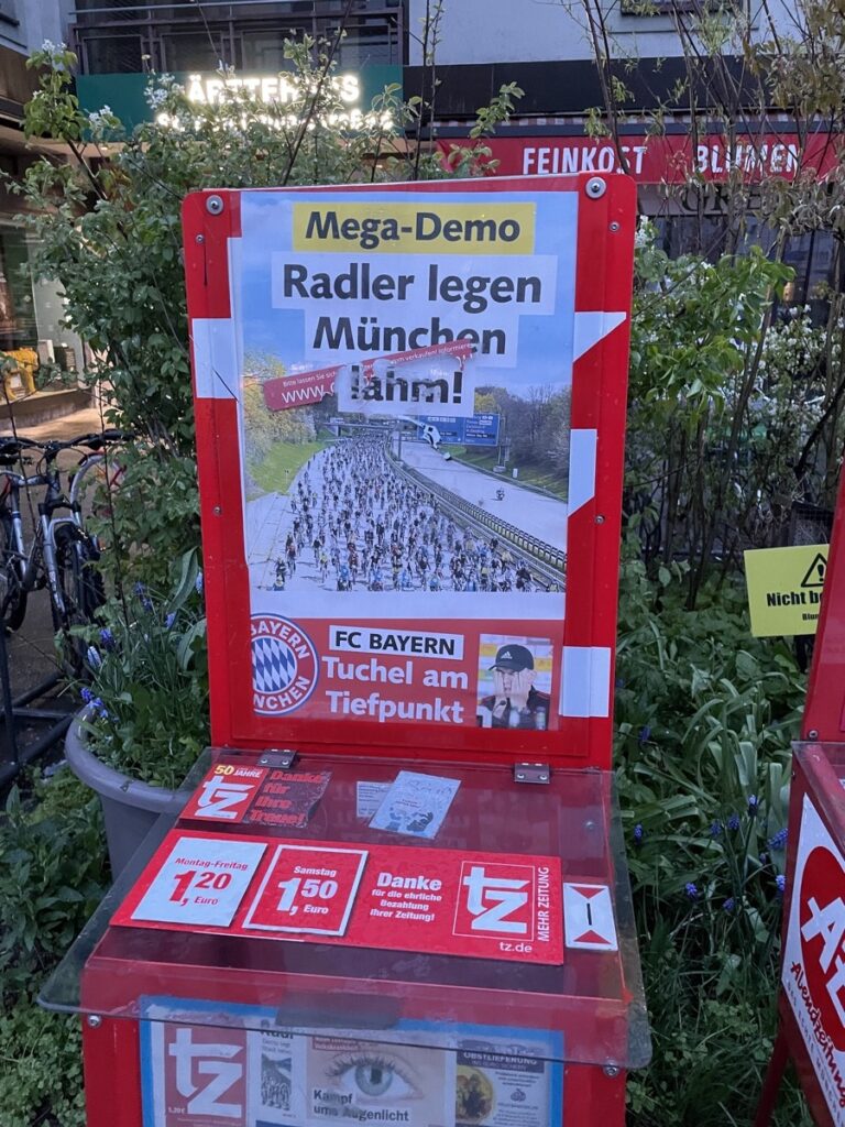 Gestern haben laut tz 18.000 Radler*innen die Stadt lahm gelegt. An allen anderen Tagen des Jahres besorgt der Autoverkehr in der Stauhauptstadt München das selbst.