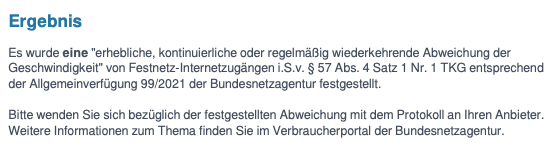 Grundsätzlich ist das alles eine gute Sache. Das Nachweisverfahren ist zwar aufwendig, aber machbar. Gut wäre, wenn das Verfahren nach der Messung noch standardisiert werden könnte. Die individuelle Auseinandersetzung mit unübersichtlichen Support-Hotlines bietet noch viele Schlupflöcher, um das ganze auszusitzen, die Handhabe des Kunden gegenüber dem Anbieter bleibt da noch recht schwammig. Die Verbraucherzentrale NRW hat ein Tool, mit dem man die Preisminderung berechnen kann und in der c’t wird das ganze auch noch mal sehr gut erklärt.