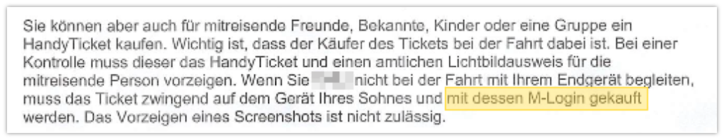 Das stimmt. Zumindest für die MVG-App. In der MVV-App, mit der man ebenfalls Tickets für den Münchner ÖPNV kaufen kann, kann man aber sehr wohl Tickets auch auf eine andere Person und Handy übertragen. Dort wäre das App und Account-Sharing also legal gewesen. In den FAQ der MVV-App wird das sogar für Minderjährige explizit als Workaround erwähnt.