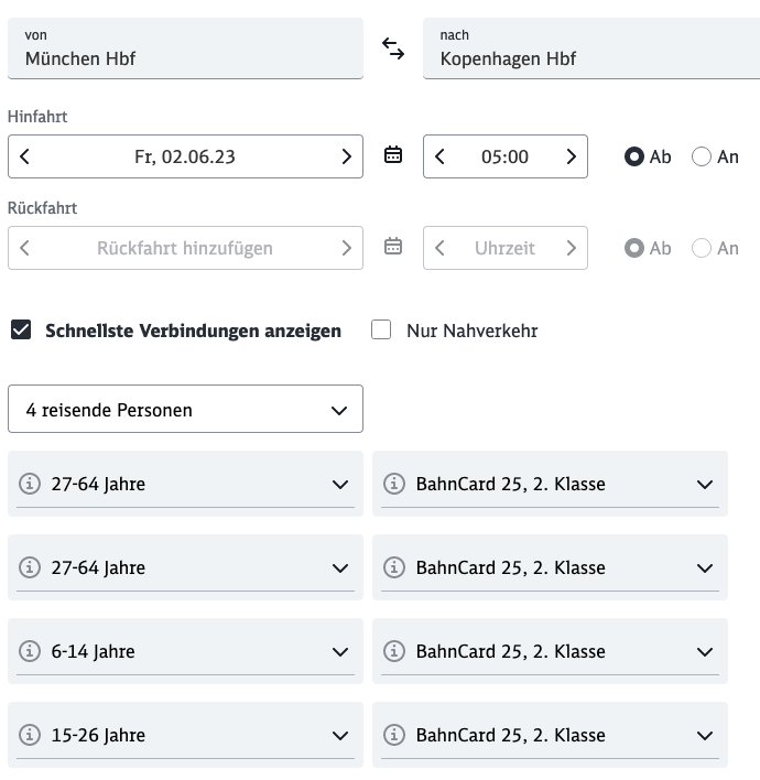 Im nächsten Schritt lande ich aber erst mal auf der internationalen Buchungsseite der DB. Die Verbindung wurde immerhin übernommen, aber ich muss noch mal für alle Mitreisende das Alter eingeben. Diesmal superexakt mit Geburtsdatum. Jetzt aber! Gleich ist es so weit …