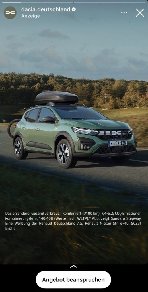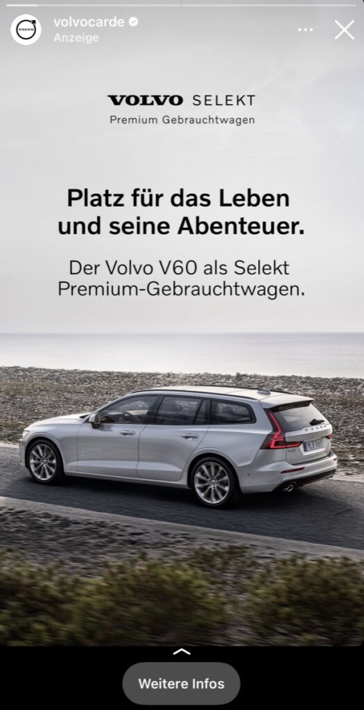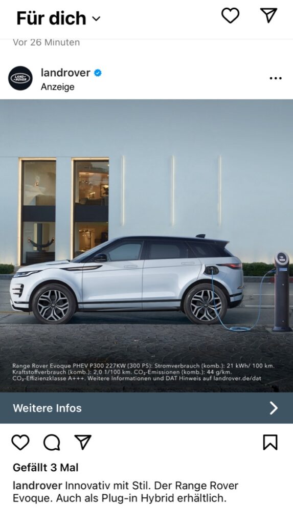 Ich scrolle nach meinem Blogpost noch ein bisschen weiter Insta und werde innerhalb von 15 Minuten zugeballert mit: Autowerbung. 18 Anzeigen.