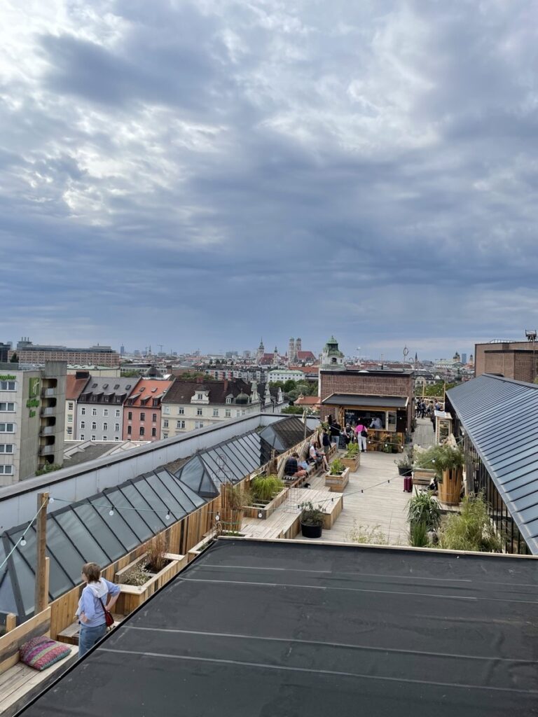 Zum Glück hab ich bisher nirgendwo das Wort Roof-Top-Bar gelesen, weil wer Roof-Top-Bar sagt, sagt auch After-Work. Ich bleib bei Feierabendbier. Maximal Feierabend-Spritz. Den trinke ich an diesem Montag spontan mit meiner Frau auf dem Dach. Die Preise sind - für Münchner Verhältnisse - ok. Man kann hier aber auch einfach so hochkommen und die Aussicht genießen, es gibt keine Konsumkontrolle. Alleine wird man dabei aber höchstwahrscheinlich nicht sein, so viel ist an diesem frühen Montagabend bei eher kühlem Wetter schon zu erahnen. Der Eingang ist ein unscheinbarer ehemaliger Notausgang, direkt wenn man von der S-Bahn hochkommt. Es gibt keinen Aufzug.