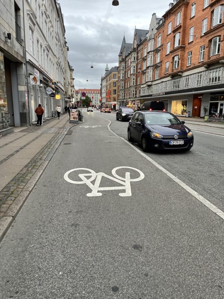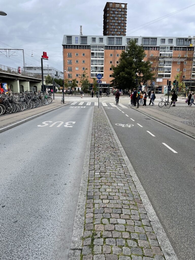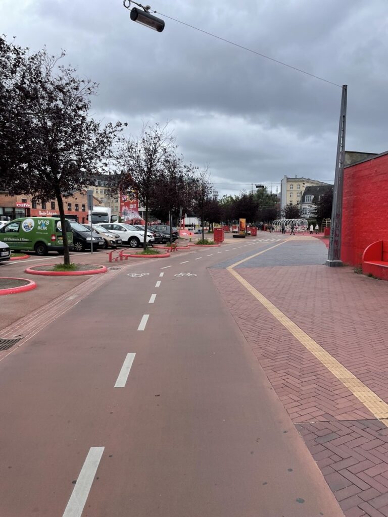 Der öffentliche Raum scheint irgendwie komplett anders aufgeteilt. Und das obwohl es natürlich auch Autos gibt. Und zwar gar nicht so wenige. Aber es gibt deutlich weniger Parkplätze am Straßenrand und das schafft diese eine Spur mehr auf beiden Straßenseiten für den Radweg und das schafft einen breiteren Gehweg. Es ist einfache Mathematik und eine Verteilungsfrage. Wem gibt man welche Priorität. Fußgänger haben mehr Platz, Radfahrer mehr Sicherheit und Autofahrer fahren deutlich rücksichtsvoller und defensiver, weil allein durch die geänderte Raumaufteilung ein anderes Machtverhältnis entsteht. Radfahrer sind viel präsenter und nicht so leicht zu übersehen. Es profitieren alle davon.