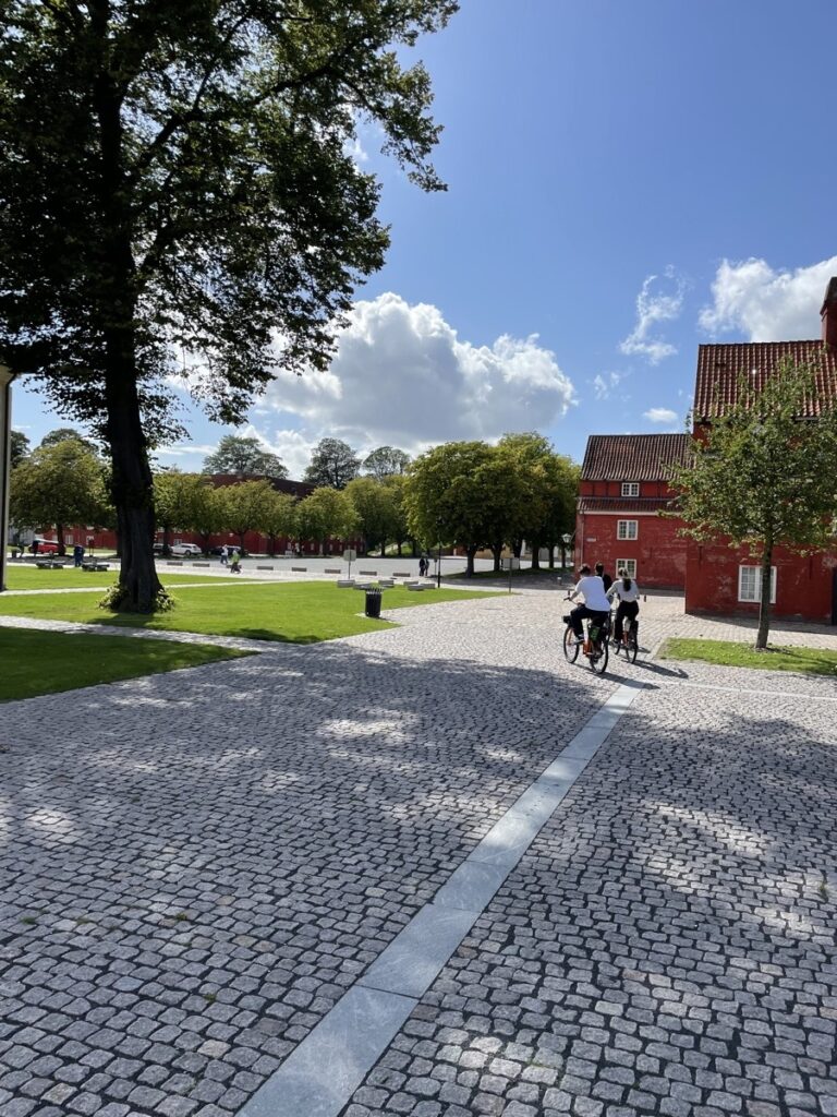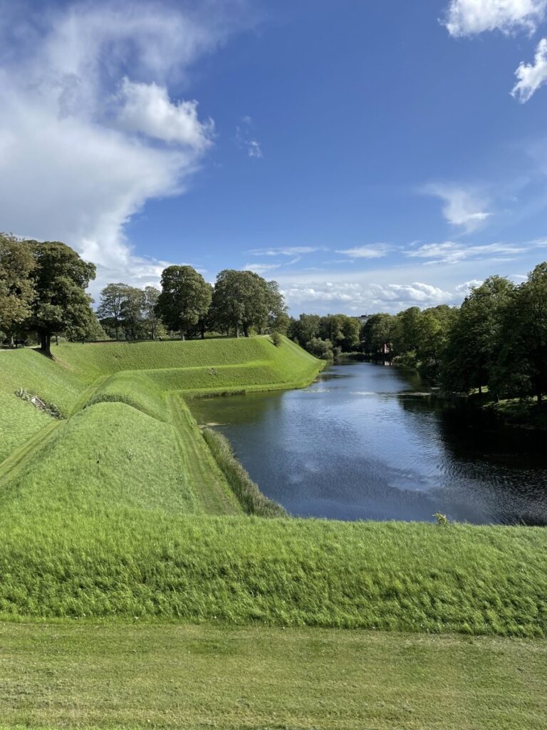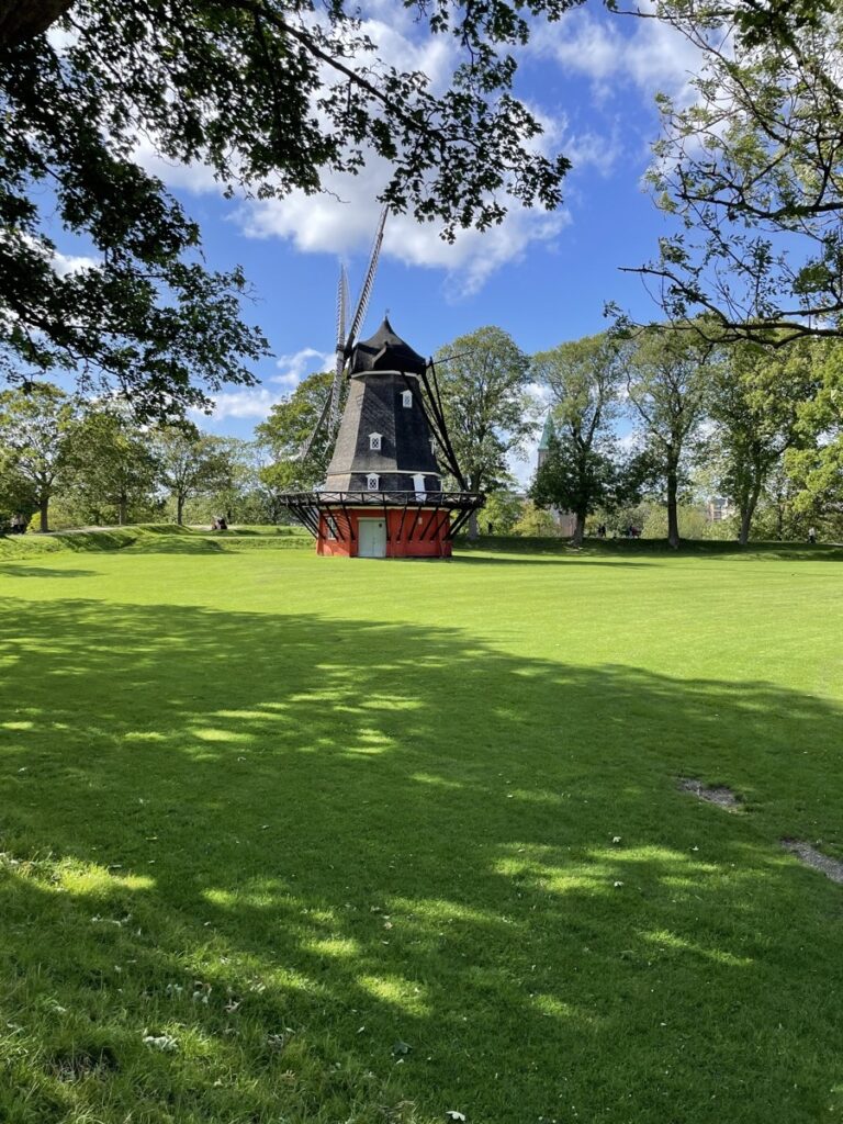 Auf dem Weg durchqueren wir mit den Rädern noch das Kastell von Kopenhagen. Eine alte Festungsanlage mit grünen Schutzwällen und einer eigenen Windmühle. Sie wird heute noch aktiv vom Militär als Kaserne genutzt und man kann trotzdem einfach so durchradeln.