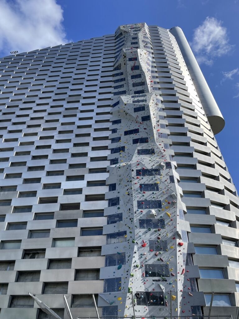 Über vorbildlich ausgebaute Radwege erreichen wir dann die Müllverbrennungsanlage Amager Bakke (aka CopenHill). Sie wurde 2018 fertiggestellt und ist, natürlich, super-zukunftsweisend was die gesamte Technik angeht und die Architektur und überhaupt. In, an und auf dem Gebäude kann man Skifahren, Klettern, was essen oder einfach nur die Aussicht genießen. Während unten Müll verbrannt wird. Der Zugang zum Dach ist, natürlich, wieder kostenlos möglich. Es gibt auch keine Schlangenattrappen, die uns davon abhalten wollen. Nur der Wind, der verhindert, dass wir das Gebäude heute betreten können. Er ist einfach zu stark und alles ist zu, weil: Sikkerhed først, wie der Däne und die Dänin sagen.