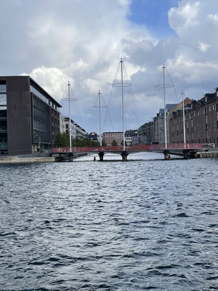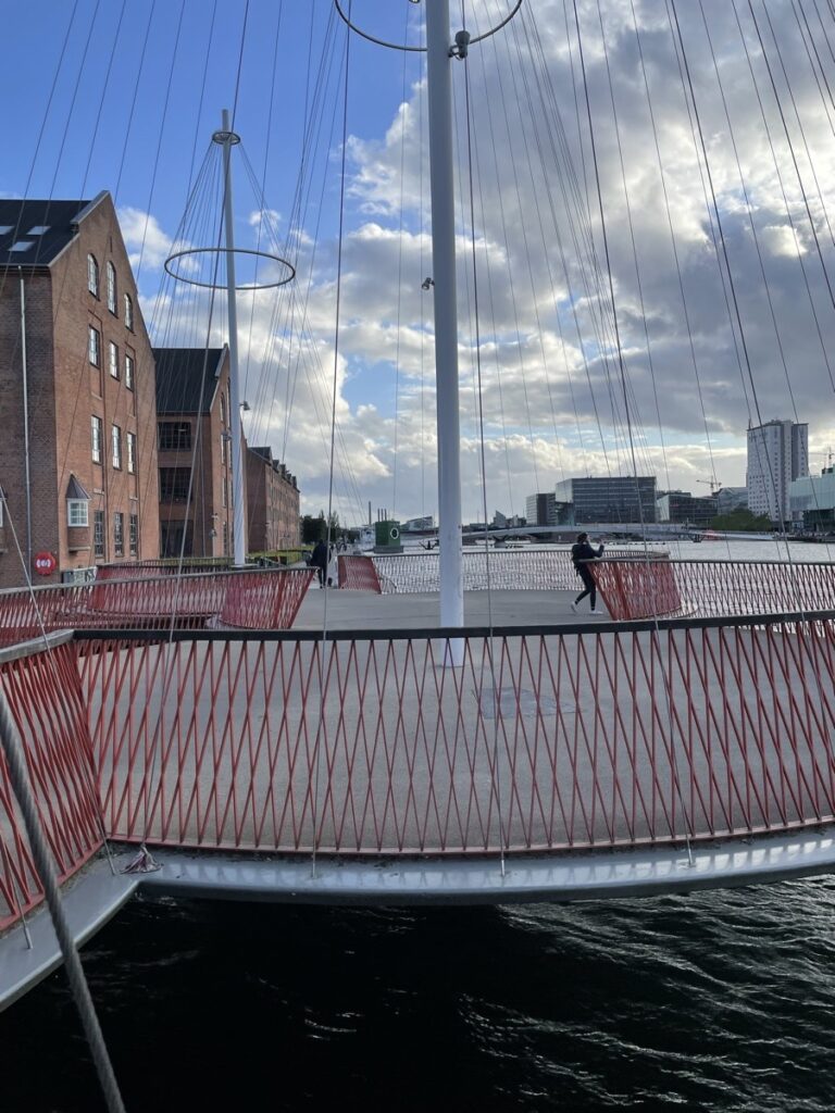 Die letzte Pause schließlich im Black Diamond. Der Royal Danish Library. Dort mit einem Kaffee rüber schauen auf die Fahrrad- und Fußgängerbrücke Cirkelbroen. Eine Brücke, die aus fünf runden Plattformen besteht und an ein fünfmastiges Schiff erinnern soll. Da müssen wir natürlich auch noch drüberadeln. Mich erinnern sie aber eher an Plattformen aus Super Mario Spielen und entsprechende Geräusche laufen in meinem Kopf beim Überqueren ab.