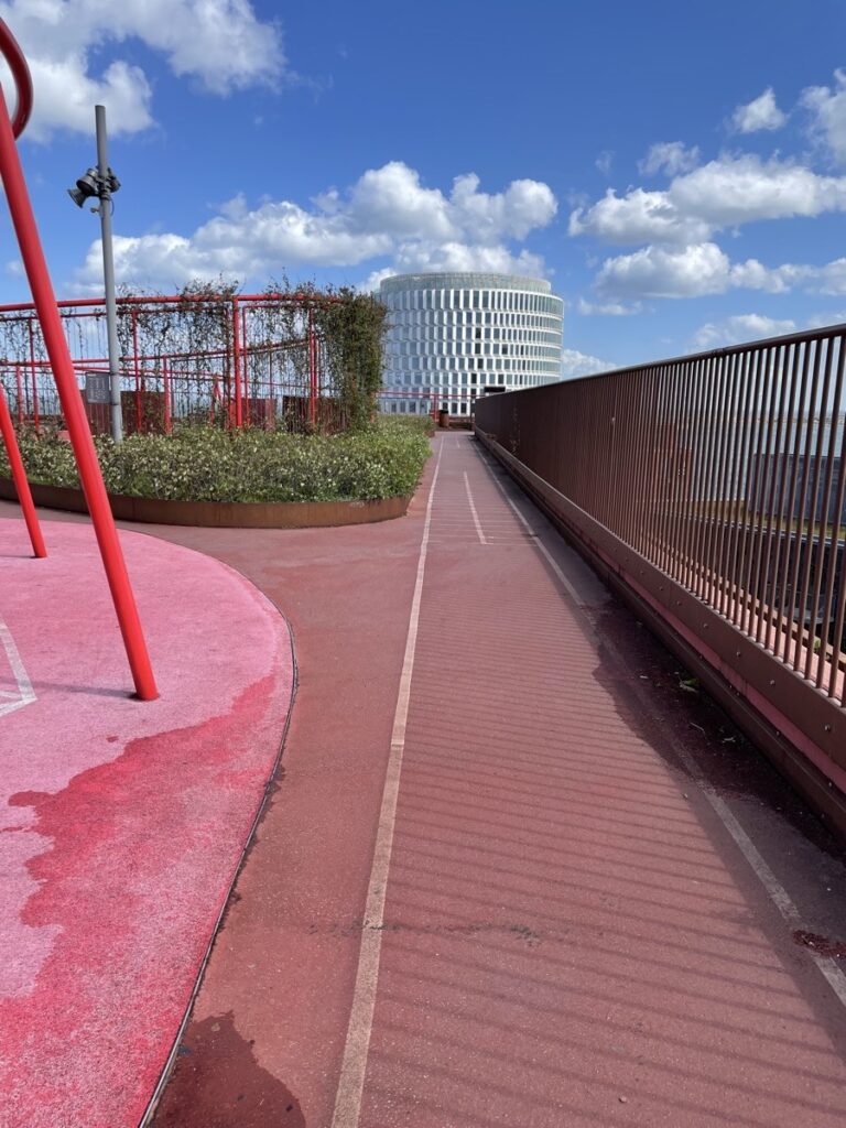 Das Dach sieht ein bisschen aus wie die Marsoberfläche. Alles rot. Und es ist ziemlich einsam da oben. Wie wohl auch das gesamte Nordhaven Quartier nicht superbelebt wirkt. Aber vielleicht ist das ja grad noch am Entstehen. Oben macht jedenfalls nur ein einzelner Dude, der so aussieht wie der eine vollbärtige Typ in der Instagram-Crossfit-Werbung, die mir aus unerklärlichen Gründen immer angezeigt wird, an den Fitnessgeräten komplett irrsinnige Sachen, die wider aller Schwerkraft sind. Da hier ja noch nicht so viele Menschen zu leben scheinen, kann es sich eigentlich nur um einen Angestellten der deutschen Botschaft handeln, der gerade Mittagspausenworkout macht. Diplomaten einfach toppfit und immer im Einsatz! Für Deutschland!