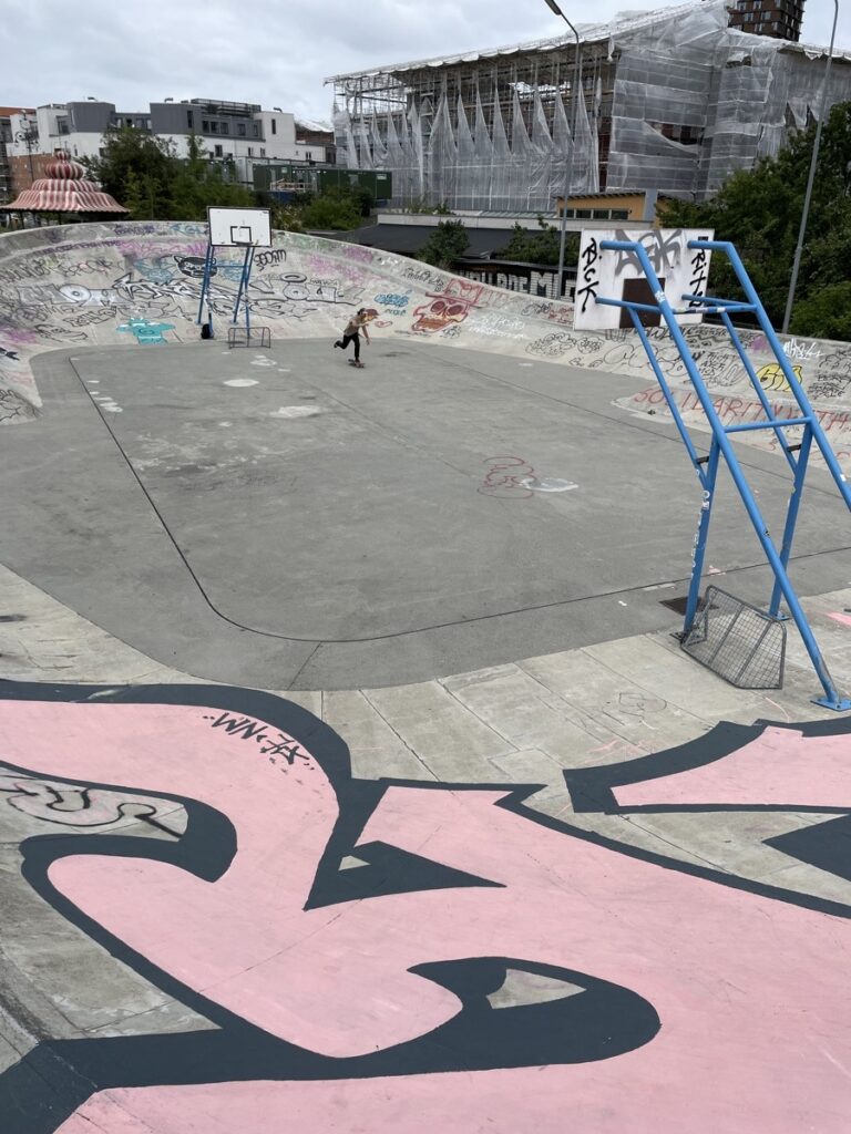Seit 2014 ist es jetzt ein öffentlicher Ort mit verschiedenen Aktivitätsmöglichkeiten, der an einen kleinen, grünen Park angrenzt. Und das Abgefahrene daran: Tagsüber ist er gleichzeitig Pausenhof und Spiel- und Sportplatz der drei direkt angrenzenden Schulen.