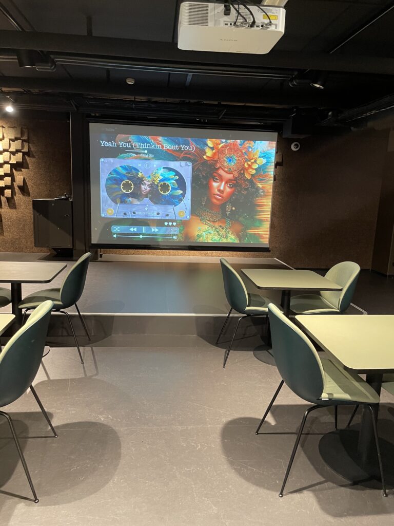 Im Keller gibt es so eine interaktive Bodenprojektionssache und dahinter einen Bandproberaum.