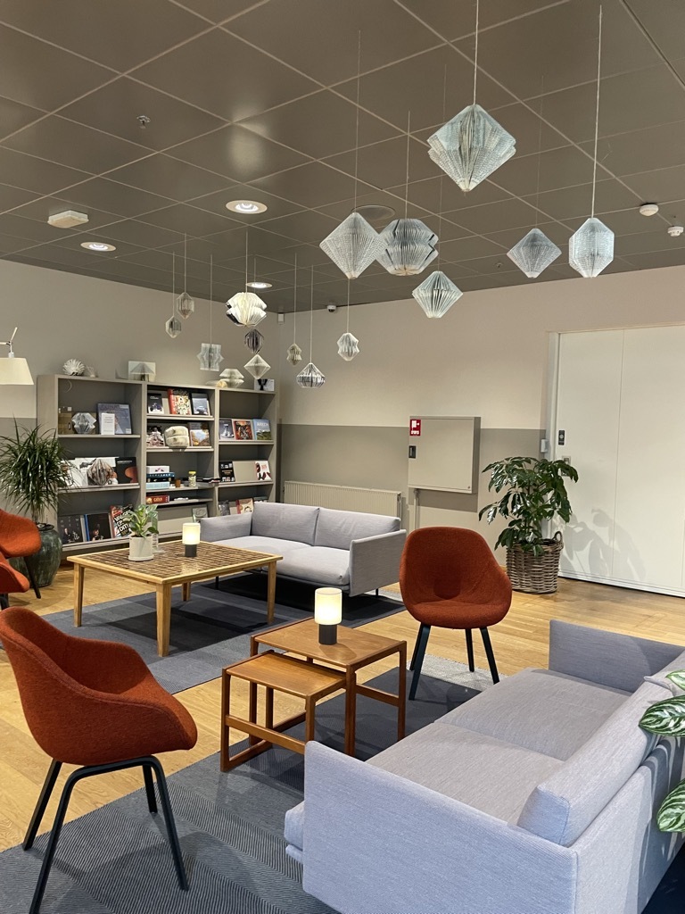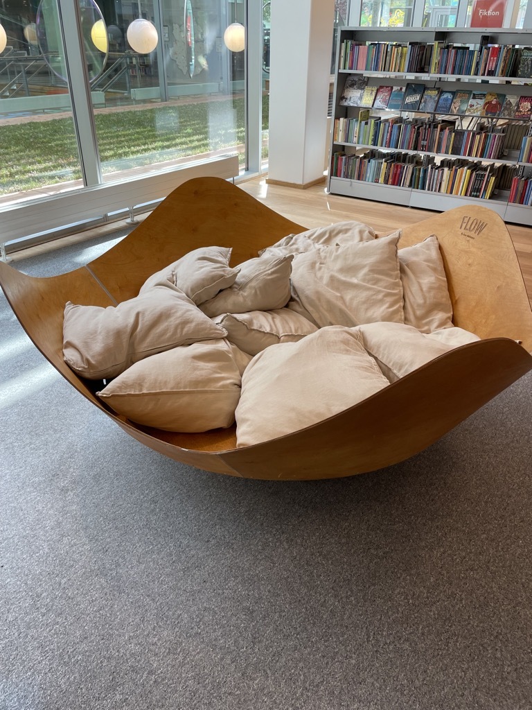 Nervig. Aber dann sind wir kurz aus dem Bahnhof raus und direkt in die Stadtbibliothek Kolding gestolpert. Von außen hätten wir sie da gar nicht vermutet. Sieht eher aus wie ein Hotel. Reingehen lohnt sich. Nicht nur, wenn man zwei Stunden ungeplanten Aufenthalt hat. Die Bibliothek ist schon fast streberhaft modern. Sie ruft an allen Ecken und Enden: Ich bin ein dritter Ort! Und das ist cool.