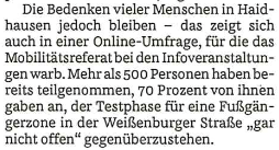 "Ganz anderer Meinung [als BA und Mobilitätsreferent] waren viele Anwesende bei der Infoveranstaltung. Sie klagten über den Wegfall von 60 Parkplätzen, den drohenden Ausweichverkehr in den Nachbarstraßen oder die mangelnde Bürgerbeteiligung."