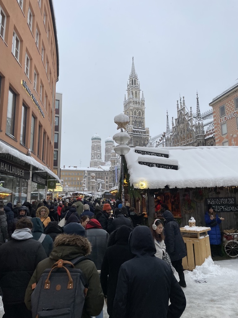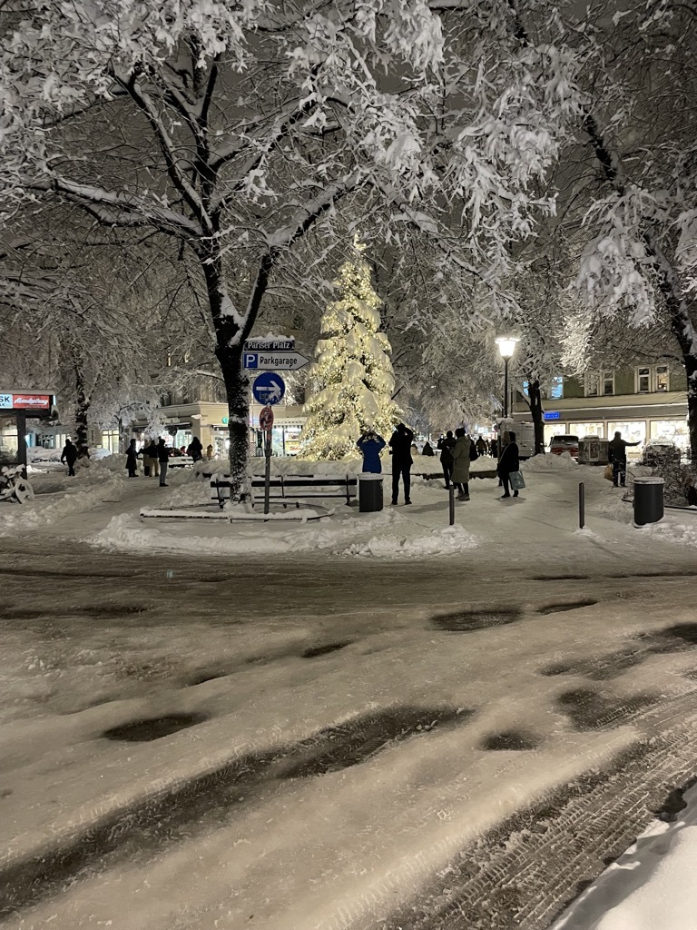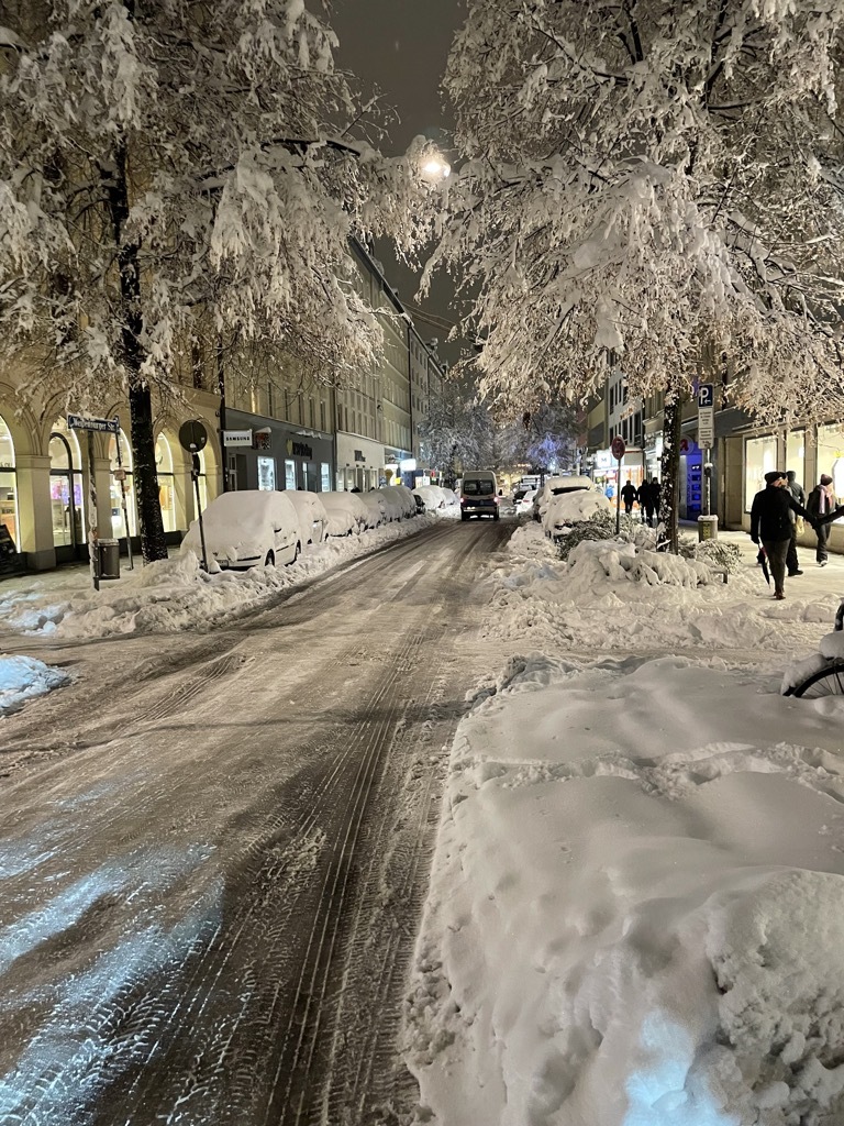 Es scheint alles still zu stehen. Der ÖPNV ist fast komplett eingestellt. Ein paar S-Bahnen fahren noch. Kaum Autos auf den zugeschneiten Straßen.