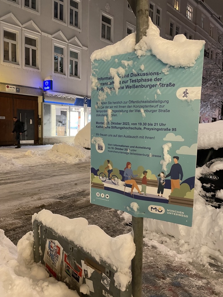 Auf dem Weg zum Weihnachtsmarkt am Weißenburger Platz geht es durch die Weißenburger Straße. Ein Teil der Straße soll nächstes Jahr probeweise für ein Jahr zur Fußgängerzone werden. Natürlich finden das nicht alle gut. Ganz im Gegenteil. Damit aber nicht immer nur die gehört werden, die dagegen sind, haben wir uns zu einer kleinen Initiative zusammengefunden, die sich für die Fußgängerzone ausspricht und Politik und Verwaltung den Rücken bei der Umsetzung stärken will.