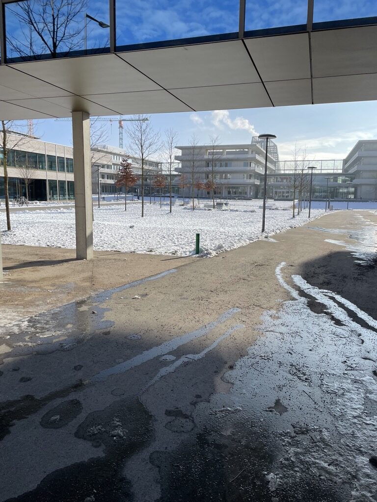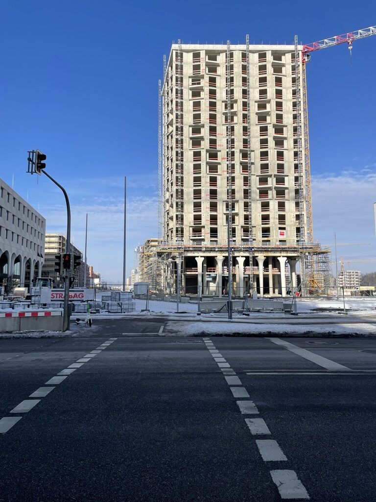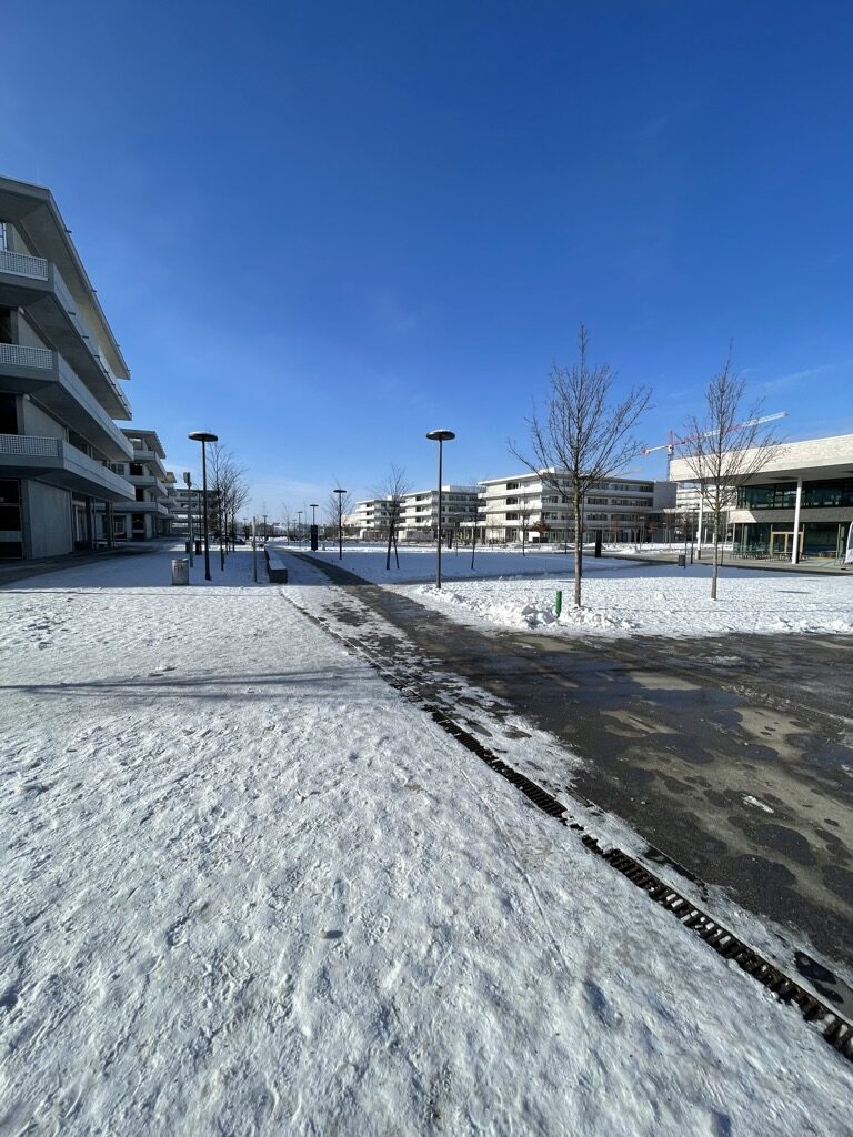 Auf der anderen Straßenseite erstreckt sich der riesige Bildungscampus. Vier Schulen, Mensa und sonstiger Pipapo. Schon eröffnet und in Betrieb.