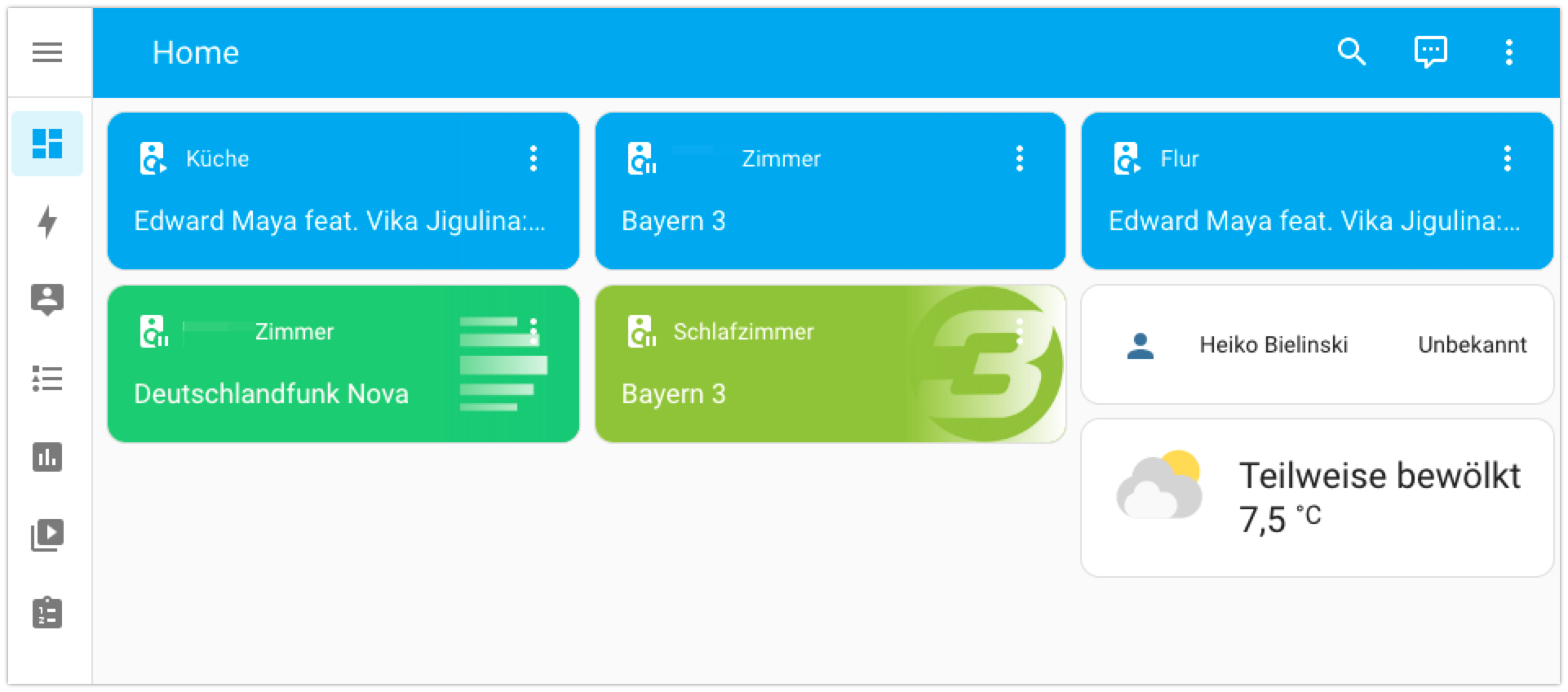 Dann ist man auch schon auf der HomeAssistant-Oberfläche. Bei mir hat das System schon automatisch die Sonos-Boxen erkannt und stellt mir Bedienelemente zur Verfügung. Außerdem wird das Wetter und mein Benutzer angezeigt. Alles noch sehr rudimentär und unattraktiv. Die eigentliche Magie wird in den nächsten Schritten entstehen, wenn wir das System nach und nach anpassen und weitere Geräte dazuschalten.