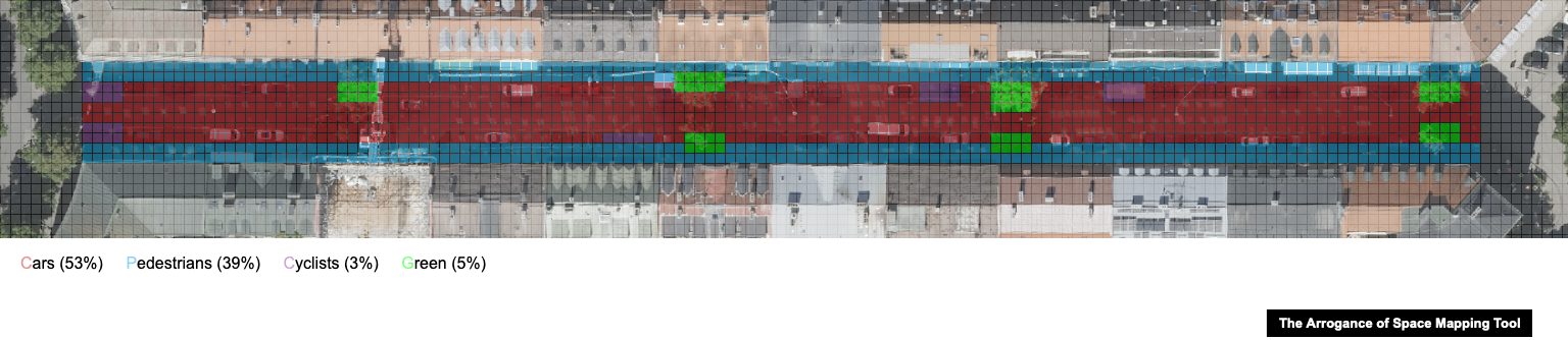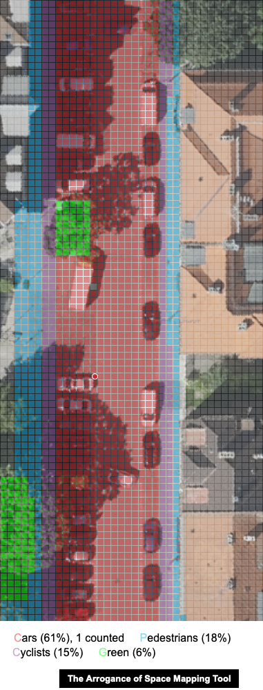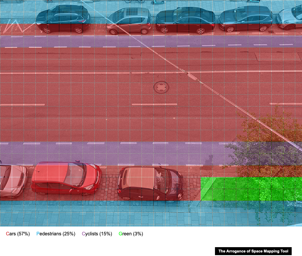 Der Stadtplaner Mikael Colville-Andersen hat ein kleines Tool gebaut, mit dem man auf einem Kartenausschnitt oder einem Foto auf einem Raster markieren kann, wie öffentlicher (Mobilitäts)-Raum genutzt wird.