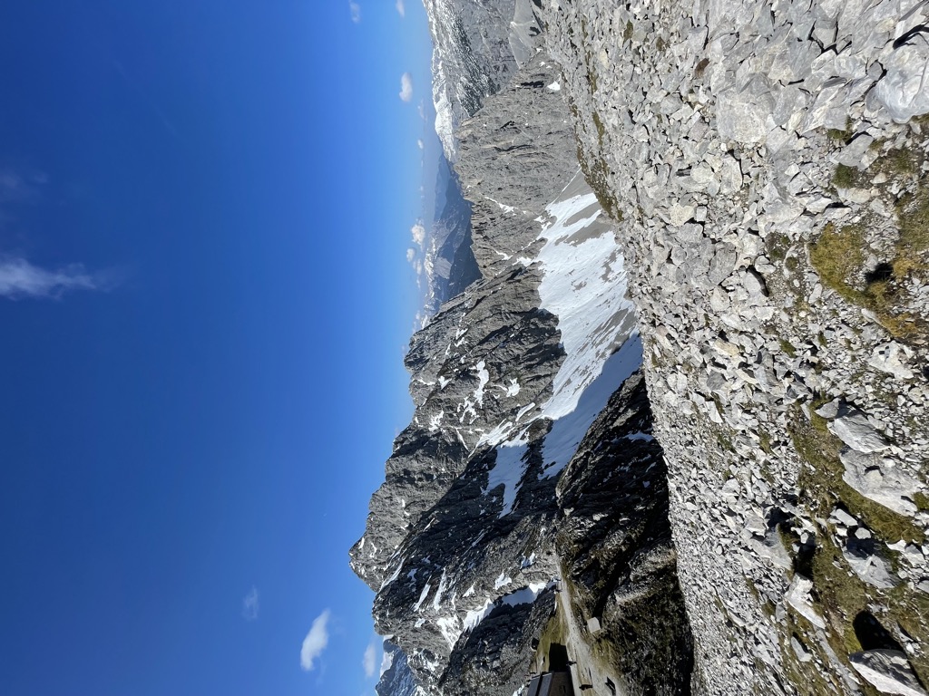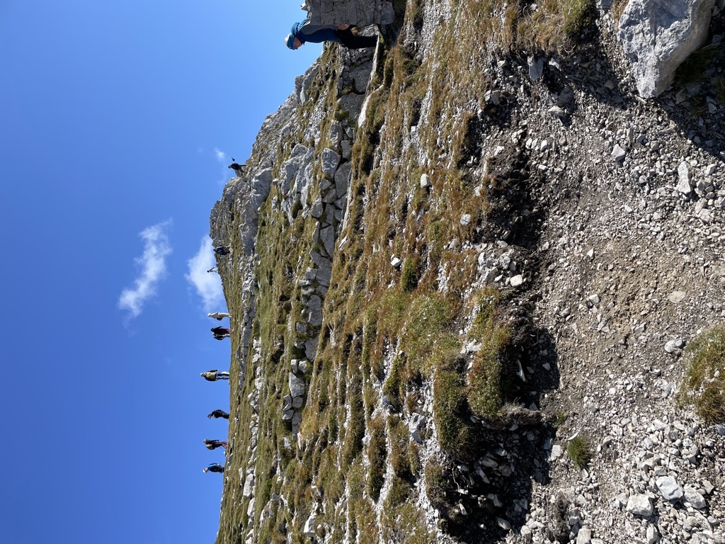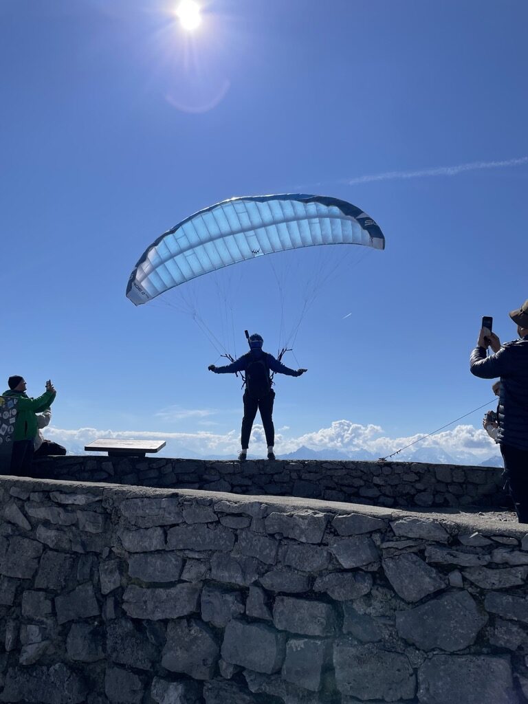 Oben am Gipfel kommt plötzlich dieser komische Vogel und stellt sich auf den Rand der Aussichtsplattform. Es geht da quasi senkrecht runter. Ich trau mich nur von hinten zu fotografieren. Das ist eine der dümmsten Dinge, die ich bisher live beobachten durfte. Er springt tatsächlich. Er scheint das regelmäßig zu machen. Jemand hat ihn vor einem Monat [