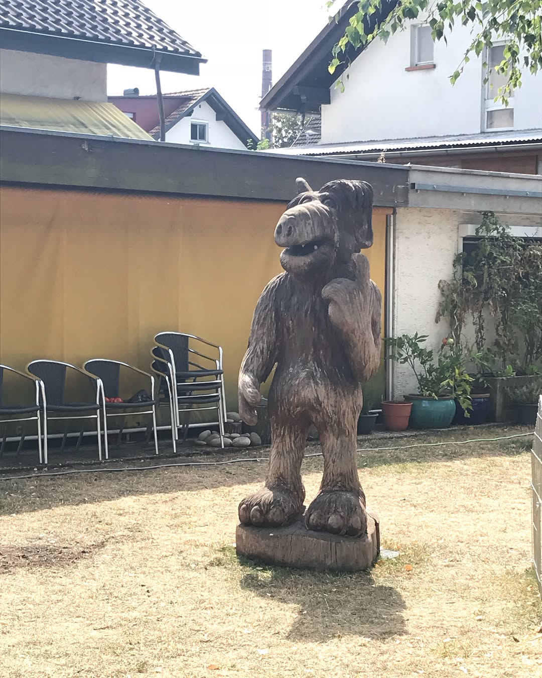 Unweit von Bregenz überqueren wir die Ach. Kurz danach in einem österreichischen Vorgarten nochmal: Ach! ALF! Mit einer Motorsäge überlebensgroß aus Holz gezimmert. Vielleicht ist Österreich doch noch nicht ganz verloren.
