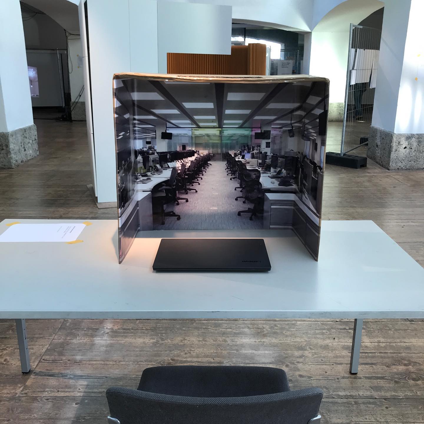 Der Kopfbau in der Messestadt Riem war das Kassengebäude für die Besuchertribüne des ehemaligen Flughafens Riem. Diesen Sommer wurde der Kopfbau zwischengenutzt. Als Nachbarschafts-Café, Popup-Bibliothek und als Raum für Kunst. Gestern, am 31.10.2020, wurde die Zwischennutzung mit einem letzten Cafébetrieb bei herrlichem Sonnenschein beendet. Ich hab die Gelegenheit genutzt und mir die kleine Ausstellung „My little Homeoffice“ angeschaut.