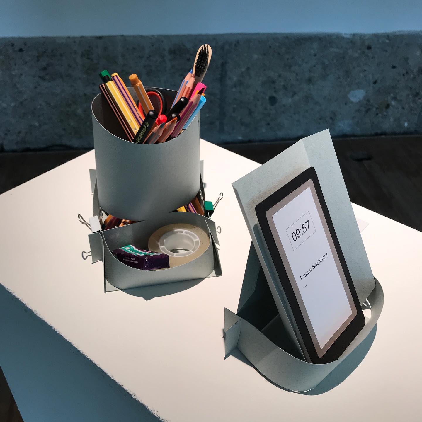 Trennung von Arbeit und Freizeit. Faltbarer Raumteiler aus Pappe.