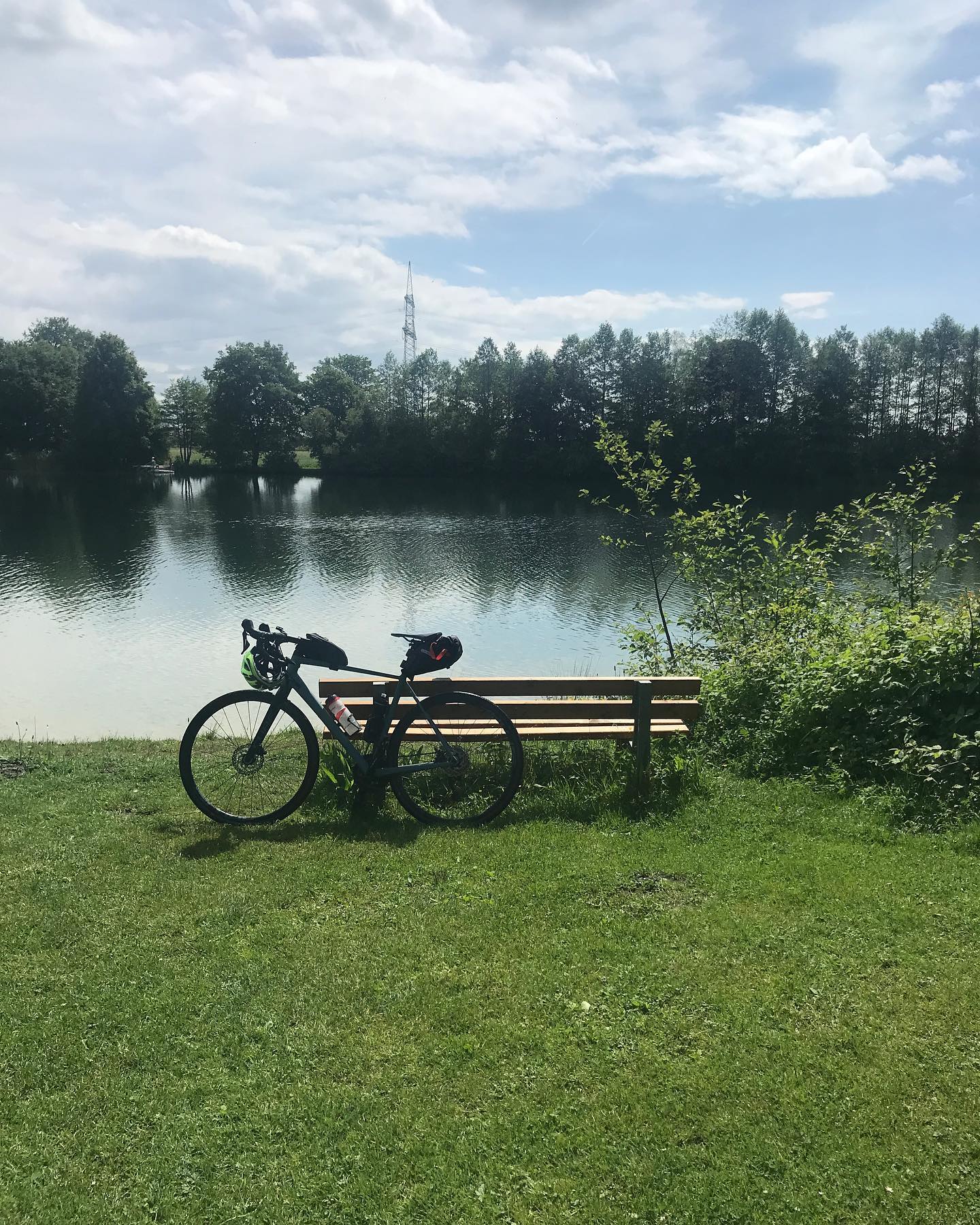 Grüner Felder vor Kränen. In Freiham wird gebaut, am Germeringer See lässt man auf der Beinebaumelbank die Beine baumeln. Tour im Blog: 🚴♂️